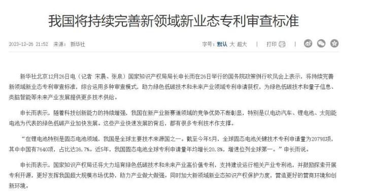 而根据国家知识产权局局长申长雨的数据,“在锂电池特别是固态电池领域,我国是全球主要技术来源国之一。截至今年5月,全球固态电池关键技术专利申请量为20798项,其中中国有7640项,占比达36.7%。近5年,我国固态电池全球专利申请量年均增长20.8%,增速位列全球第一。”